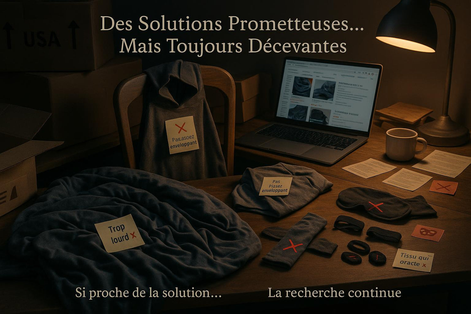 Thomas a passé des nuits entières à chercher des solutions. Il a commandé des produits venus des États-Unis : couvertures lestées, hoodies sensoriels, cocons de compression. À chaque nouveau colis, notre espoir renaissait. Et si c'était enfin ça ? Et si cette fois, nous allions enfin trouver la paix ? Mais systématiquement, la déception suivait. Trop lourd, pas assez enveloppant, inconfortable pour dormir, tissu qui gratte... Louise refusait de les porter, et moi-même je ne trouvais jamais ce sentiment de sécurité totale que je recherchais. Nous étions si proches de la solution, mais il manquait toujours quelque chose d'essentiel.